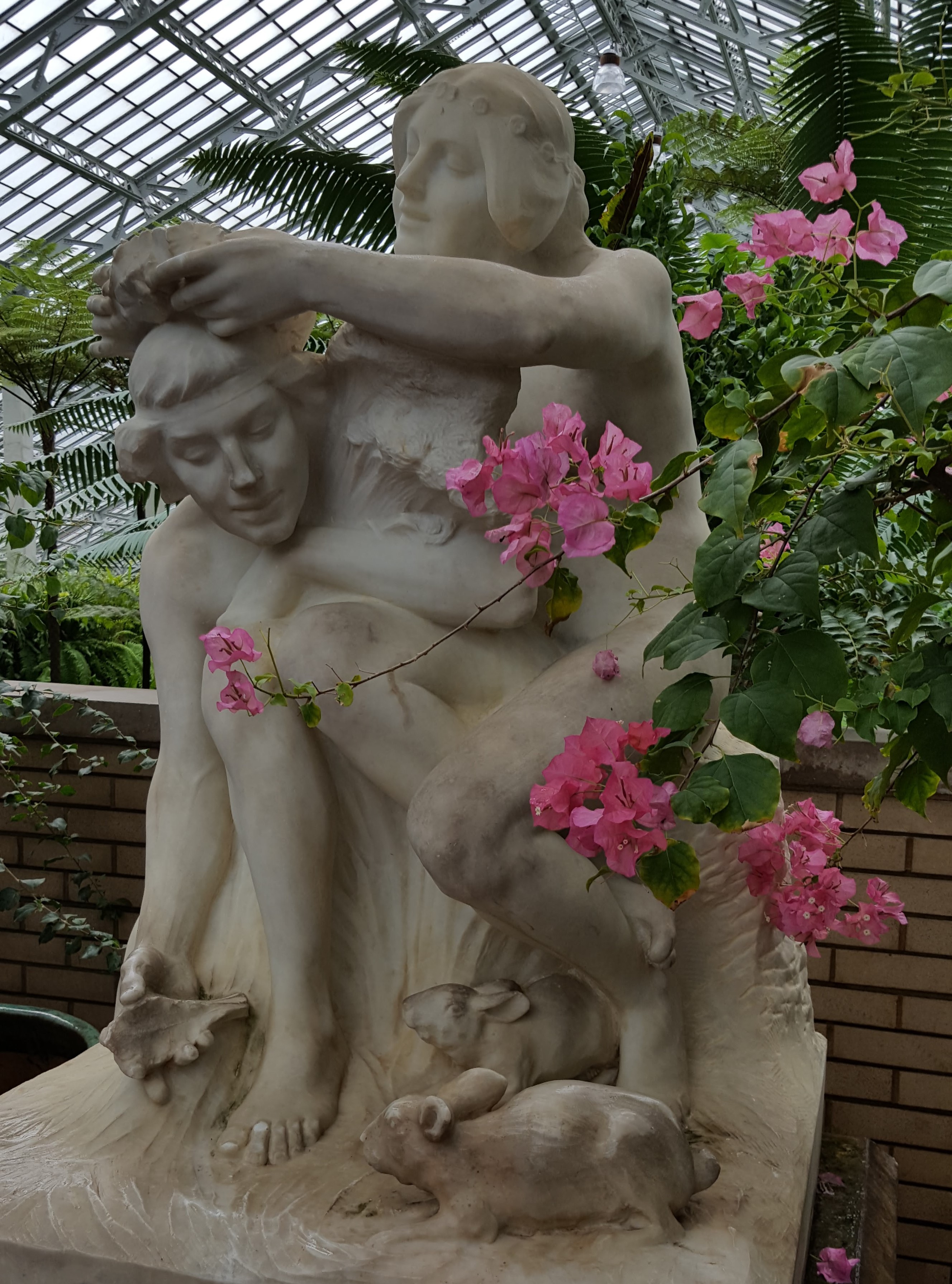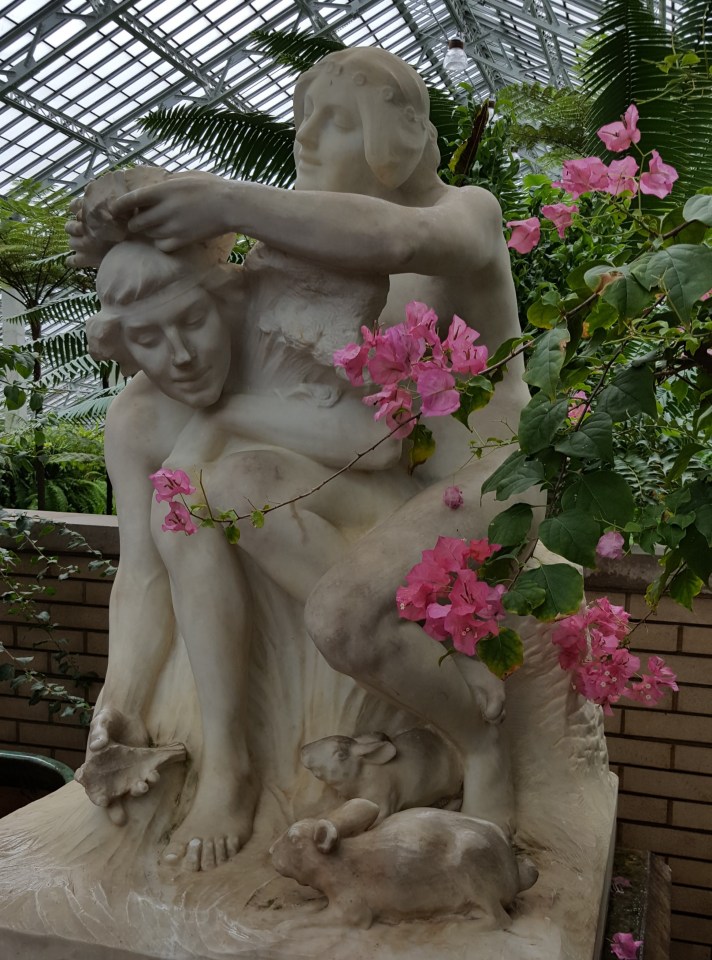 20160510_141701 ← Previous Next → This sculpture is called “Pastoral.” Lorado Taft originally sculpted it for a 1909 art exhibition. It was moved to the Conservatory’s Palm House in 1913.